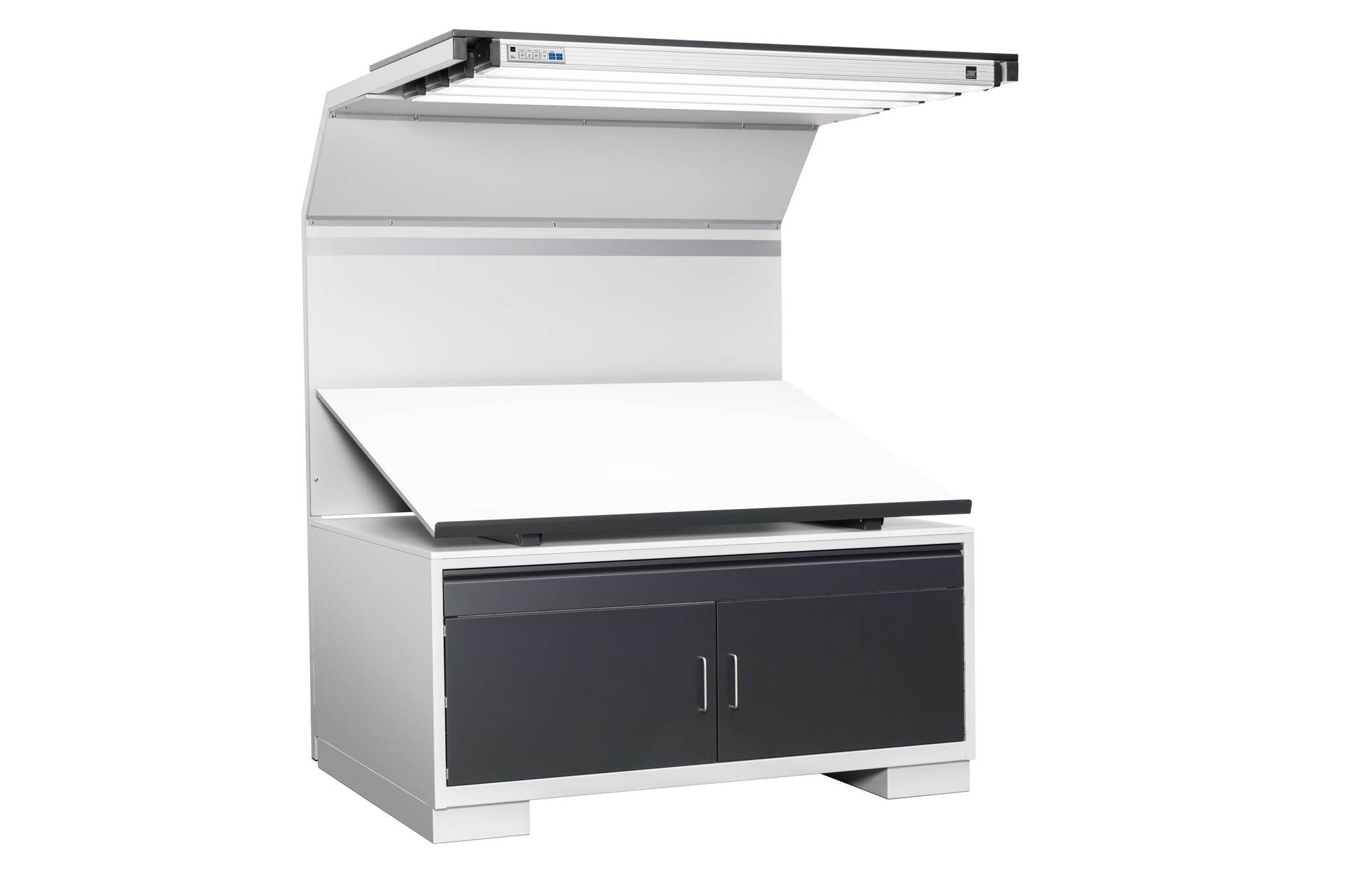 • Practical cabinet with inclinable work surface for organized storage of proofs and prints