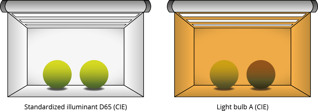 For standardised colour control it is necessary to choose D50 lighting for prints and D65 for industrial products, e.g. coatings, plastics, varnish etc. If detecting metamerism of the colours or substrates is required, additional illuminants/light sources are needed.