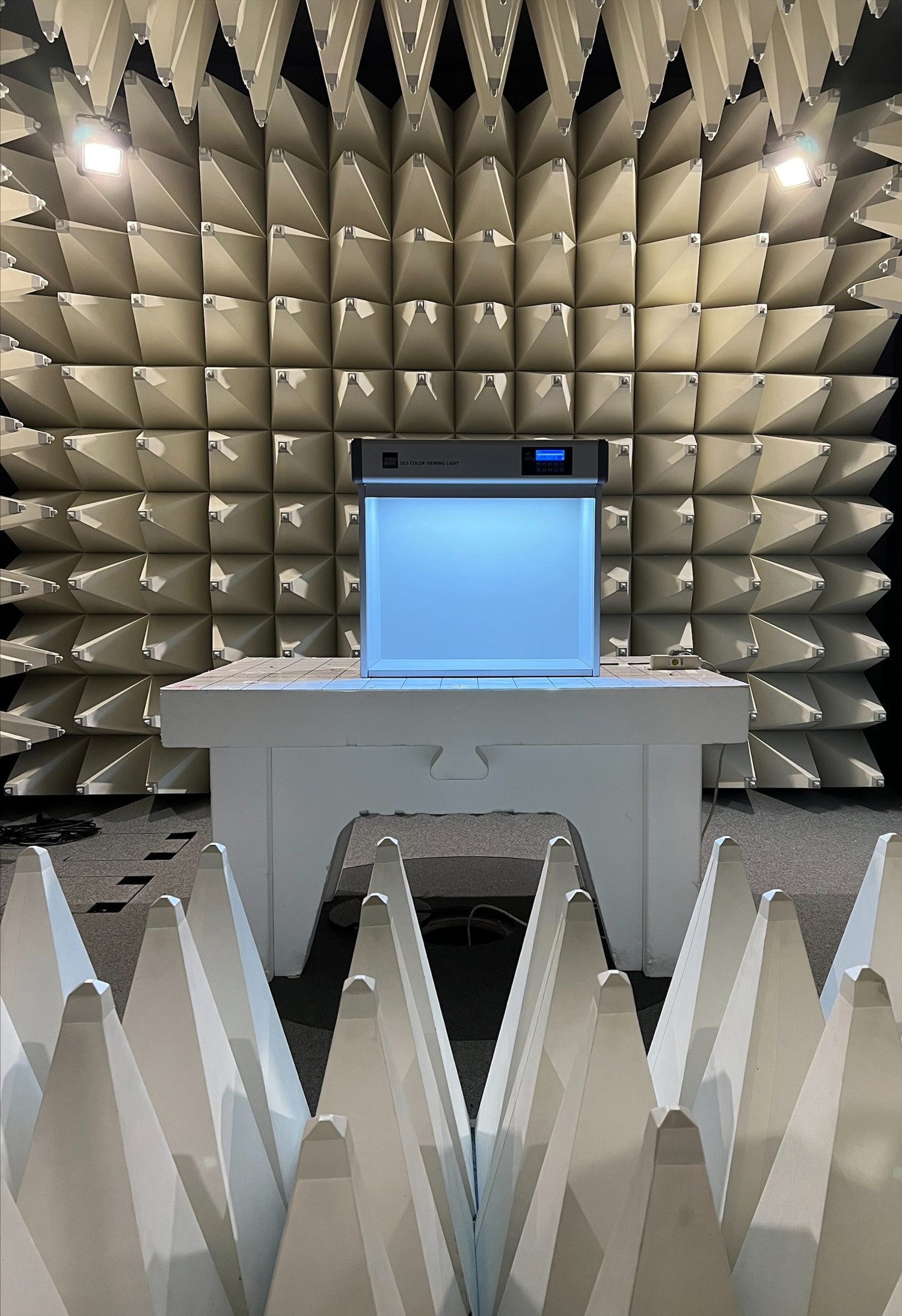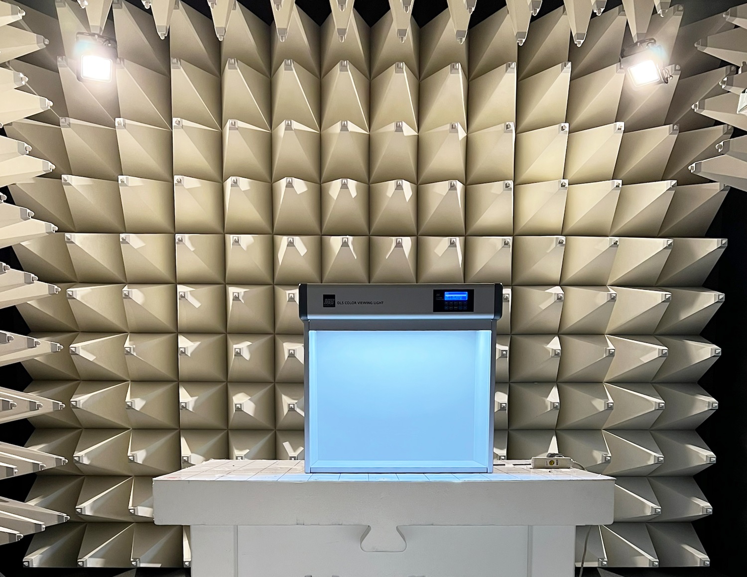 The new DLS Color Viewing Light v8 under higher voltage at the end of February. The light booth was tested for its electromagnetic compatibility (EMC). The EMC test characterises the electromagnetic compatibility of an electrical or electronic product or device and is an important quality feature of electronic products. The EMC test is required for market approval.