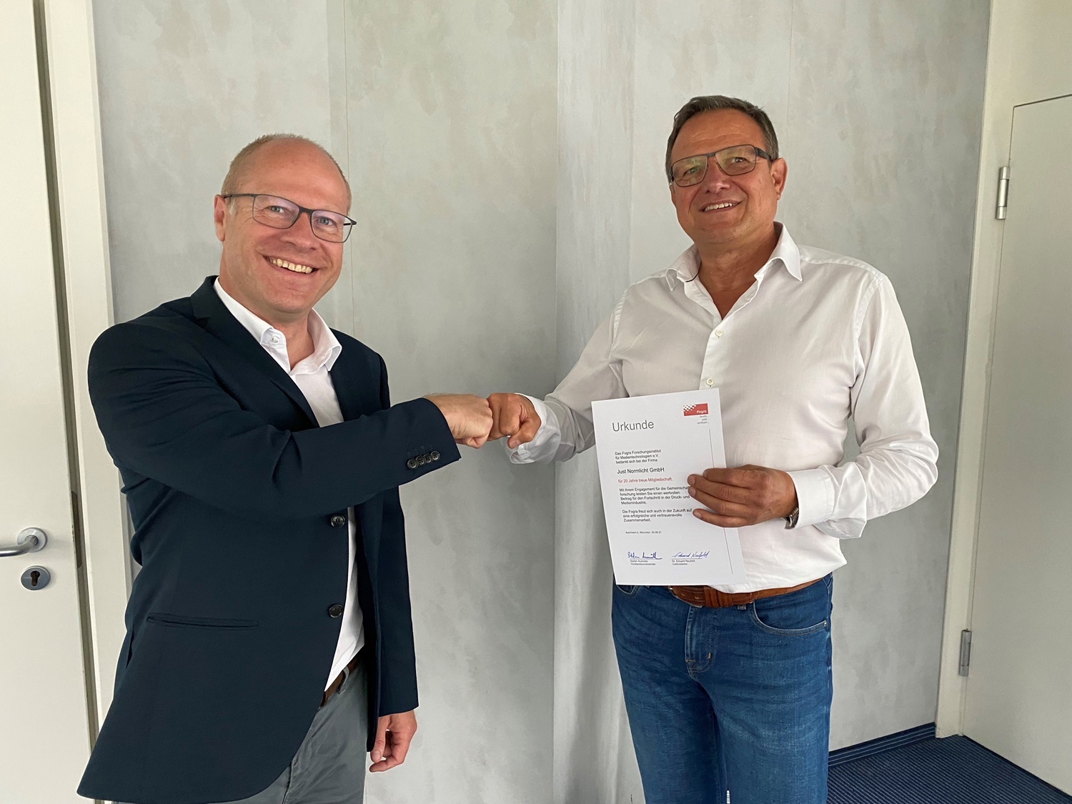 Since 2001, JUST Normlicht has been working side-by-side with the Fogra Forschungsgesellschaft Druck e.V. in the development of colour communication standards. Fogra now honors JUST Normlicht for 15 years of partnership.