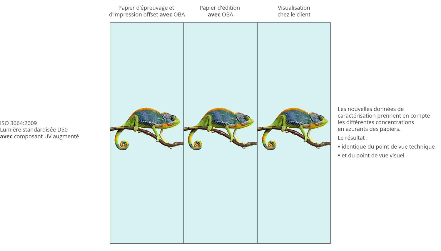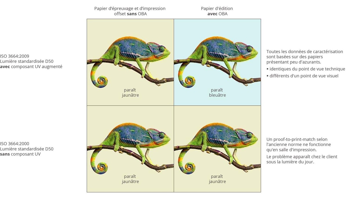 Ainsi que les papiers d’épreuvage et d’impression offset correspondants avec azurants optiques (OBA). En association avec un illuminant JUST normalisé D50 selon ISO 3664:2009, vous pouvez désormais voir exactement ce qui a été auparavant défini, éprouvé, mesuré et enfin imprimé. Et votre client le voit également.