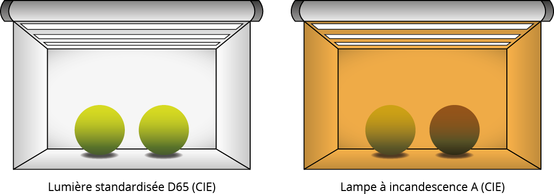 Pour évaluer le métamérisme - deux échantillons de couleur qui semblent être similaires sous un éclairage et différents sous un autre éclairage - les échantillons doivent, selon la norme, être aussi observés sous illuminant CIE A (lampe à incandescence). Dans l'exemple ci-contre, les deux objets disposent de spectres différents qui peuvent apparaître autrement selon l'éclairage.